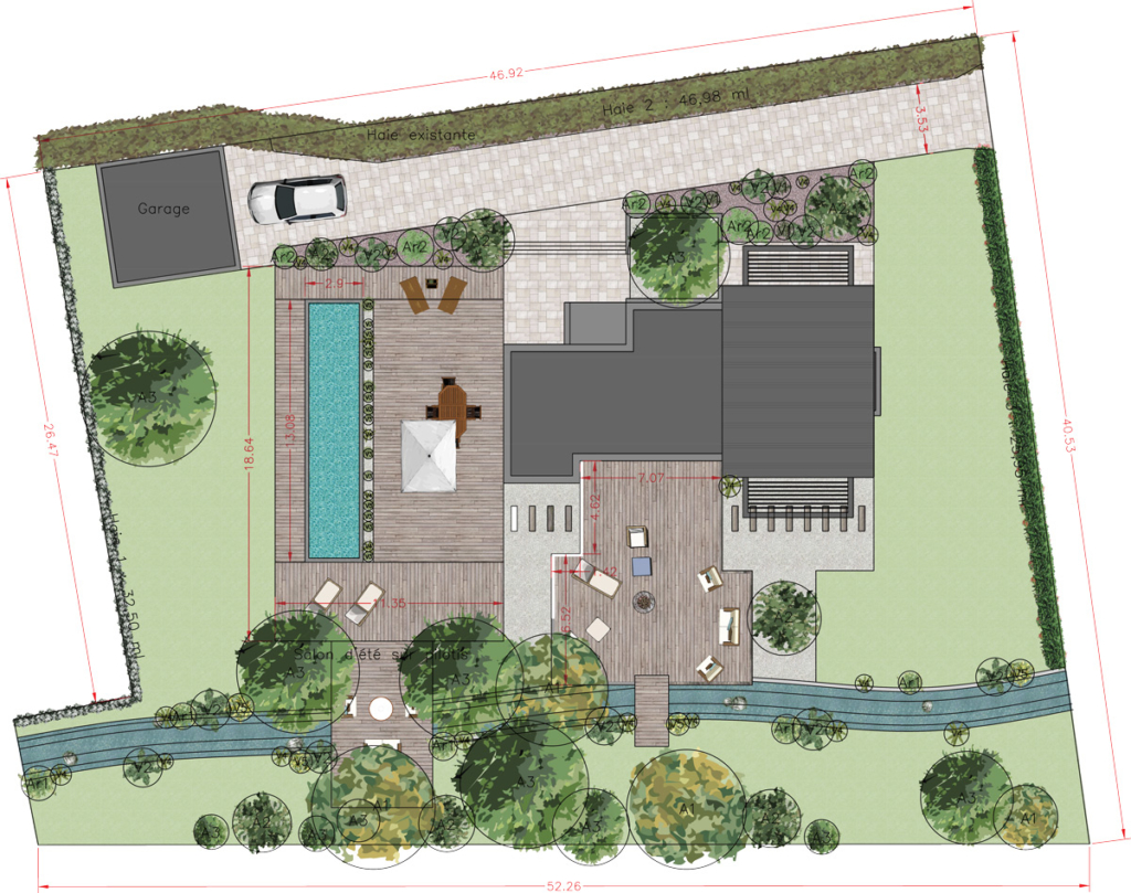 Cette solution permet la création de plan 2D pour la présentation du projet à votre client. Une grande variété de matériaux, végétaux ou textures permet de réaliser un plan détaillé, clair et proche de la réalité. Possibilité d’implanter des solutions de jardins comme le système d’arrosage automatique par exemple. Un système de cotation vous permet de matérialiser le schéma au centimètre près pour une étude optimale. Il pourra ainsi servir de plan à votre équipe d’intervention durant les travaux.